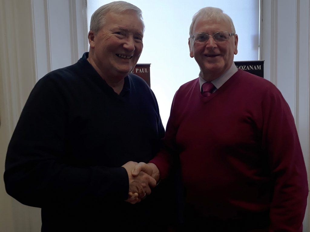 Former president Jim McKendrick (left) welcomes successor Danny Collins.