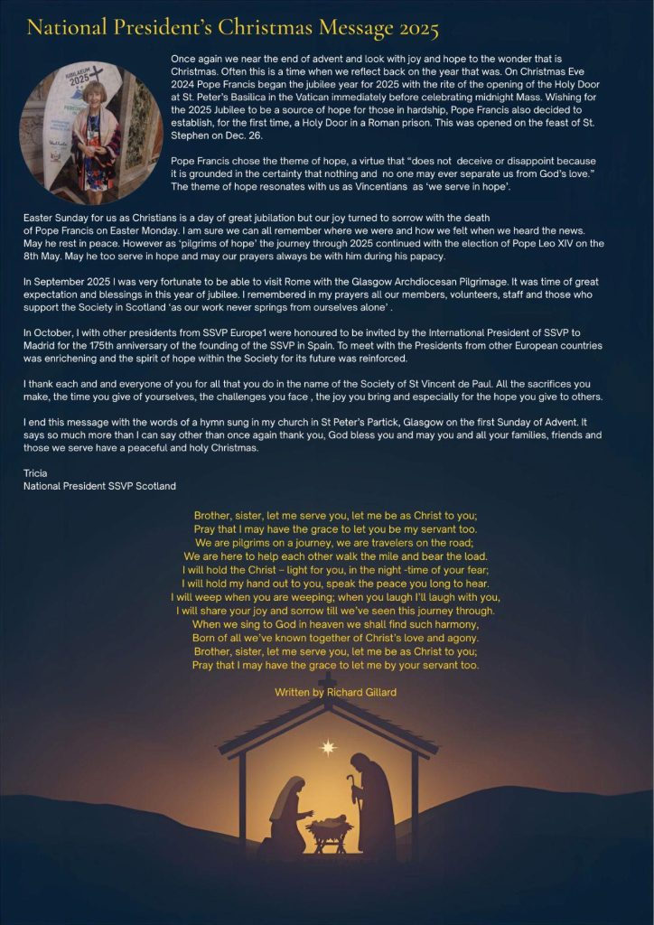 Christmas Message 2025 ssvpscotland2026-01-09T13:11:12+00:00 Share This Story, Choose Your Platform! FacebookXLinkedInTumblrPinterest Related Posts SSVP Youth – Advent and Christmas Reflections 2025 SSVP Youth – Advent and Christmas Reflections 2025 January 20th, 2026 | 0 Comments 4th Sunday of Advent 4th Sunday of Advent December 21st, 2025 | 0 Comments Festive Spirit Shines at St Ninian’s Primary School, Livingston Festive Spirit Shines at St Ninian’s Primary School, Livingston December 10th, 2025 | 0 Comments Second Sunday of Advent Second Sunday of Advent December 6th, 2025 | 0 Comments First Sunday of Advent First Sunday of Advent November 30th, 2025 | 0 Comments