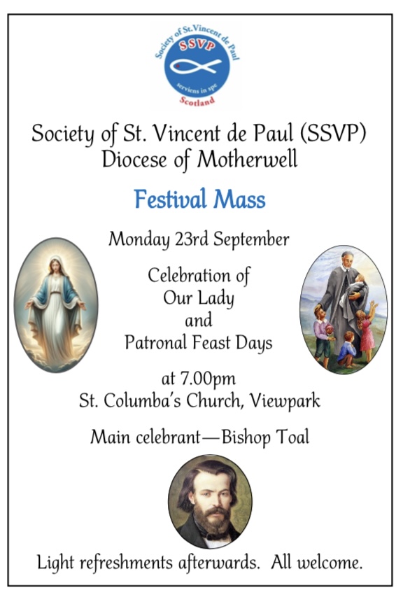 The SSVP Diocese of Motherwell Festival Mass will take place on Monday 23rd September at 7.00pm in St Columba’s Church, Viewpark. Please come along!